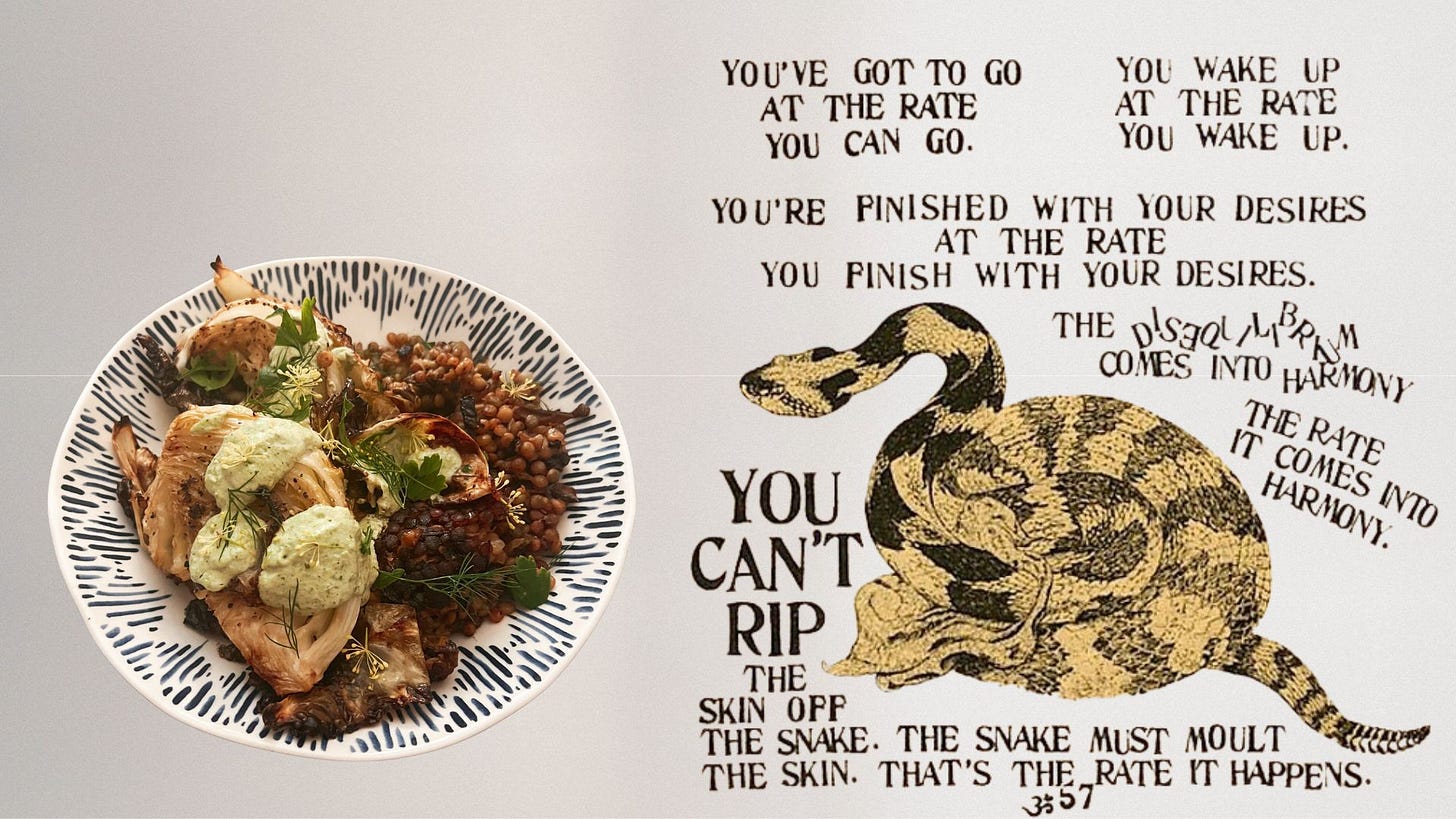 Yesterday was Seth’s birthday, and I had planned a meal all week that I knew would remind him of his grandmother and make him feel connected to his ancestors on his special day. I wasn’t following a recipe, but I’d heard some stories of the Jewish Hungarian dishes that were her love language to him, and I innovated. I braised cabbage steaks, I fried mushrooms, I did my best approximation of farfel using pearl couscous, I made an herbal, sweet, and tangy sauce to tie it all together, garnishing with dill blossoms and serving it with all of my love.